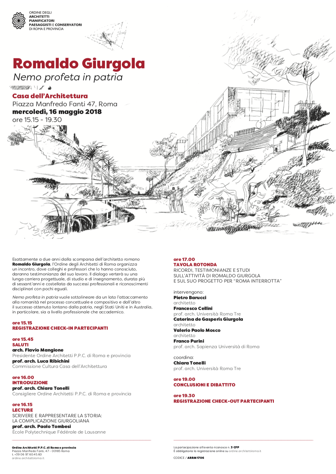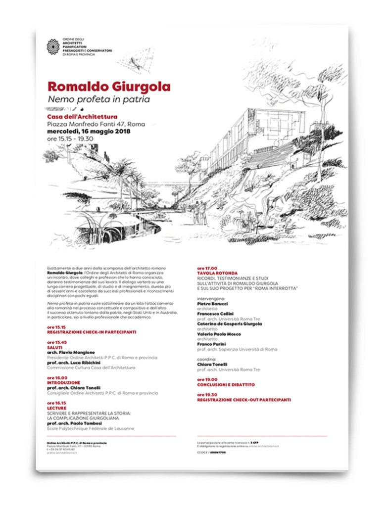 febbraio 2, 2021febbraio 5, 2021 Romaldo Giurgola – Convegno presso l’Ordine degli Architetti di Roma Ordine degli Architetti Pianificatori Paessagisti e Conservatori di Roma e Provincia Anno 2018 Luogo Casa dell'Architettura, Roma LocandinaDownload Condividi: Invia un link a un amico via e-mail (Si apre in una nuova finestra) E-mail